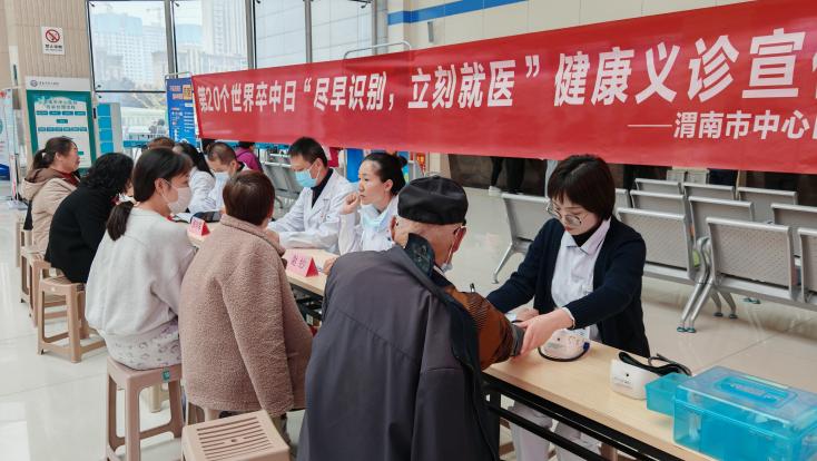 10月29日上午,在第20个“世界卒中日”与重阳节“喜相逢”的特殊日子里,渭南市中心医院神经内科党支部联合介入科、急诊科、神经外科及护理服务队成员在门诊大厅西侧举办第20个“世界卒中日健康科普义诊活动”,以“医”暖重阳。