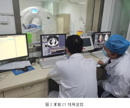 患者李某,男,63岁,发现肺部结节3月余。入住市中心医院后完善相关检查检验,并结合患者症状及体征,经检查患者无明显手术禁忌,符合手术指征,积极行术前准备,考虑结节较小且恶性程度可能性大。在杨斌主任医师与李卫国副主任医师的细致讨论下,交换意见后明确此类微小的肺结节于腔镜下较难寻找,加之CT片的解剖位置会发生一定变化(右肺不能膨起),难以利用触感去确定其具体位置及边界,尤其是质地与肺组织相近的占位,故决定术前1小时给予CT穿刺定位,明确占位方位及所需切割大致边界,以便后续手术安全且迅速实施。