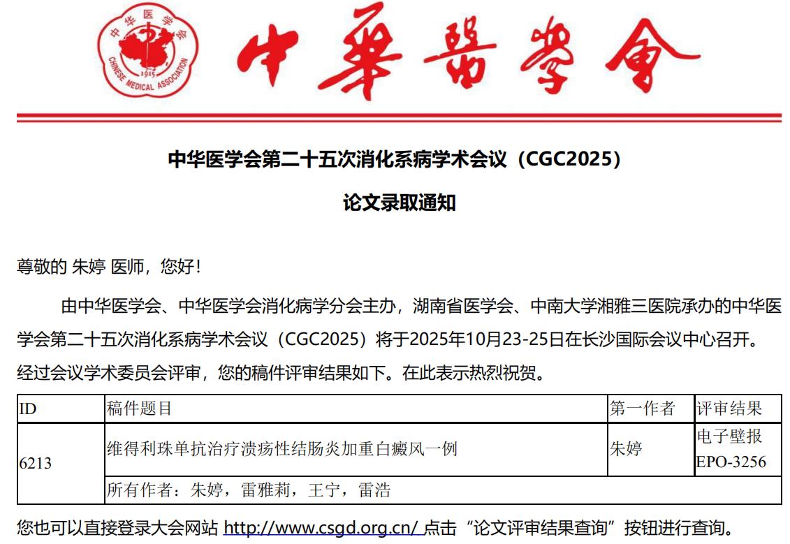 10月上旬,由渭南市中心医院消化内科朱婷、雷雅莉、王宁及麻醉手术科雷浩共同完成的个案报告《维得利珠单抗治疗溃疡性结肠炎加重白癜风一例》,成功入选中华医学会第二十五次全国消化系病学术会议(CGC2025)电子壁报交流环节,并在长沙召开的会议上进行展示。
