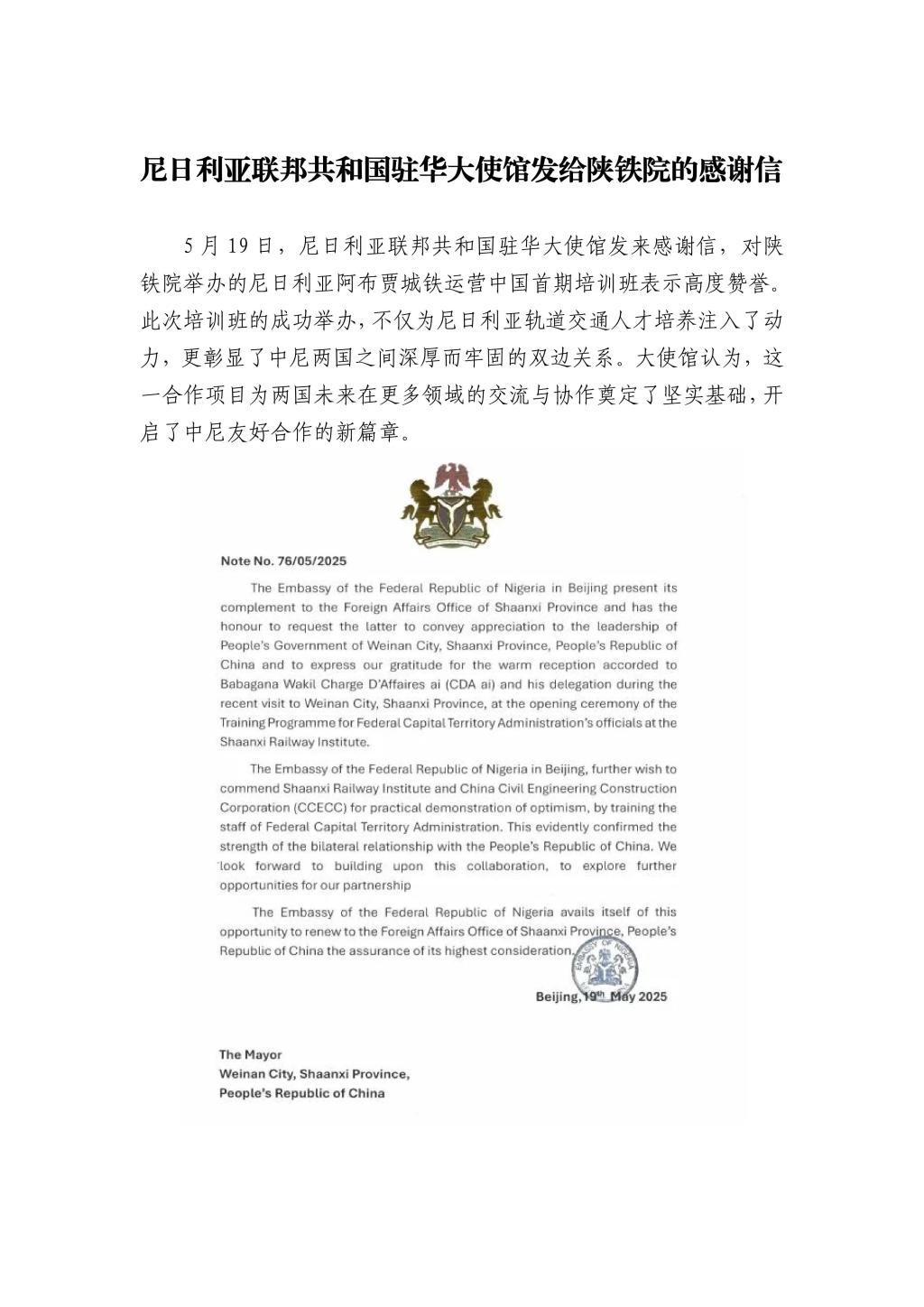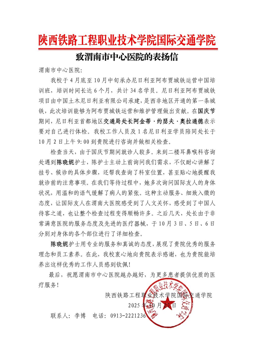 近日,陕西省渭南市中心医院收到一封情真意切的表扬信。来信方——承办尼日利亚阿布贾城铁运营中国培训班的陕西铁路工程职业学院国际交通学院,在信中特别对医院耳鼻咽喉头颈外科门诊分诊台护士陈晓妮提出表扬,称赞她以专业贴心的服务,不仅深深打动了前来体检的尼日利亚首都地区交通局处长阿金蒂·约瑟夫·奥拉通德,也生动展现了中国医疗服务的温度。