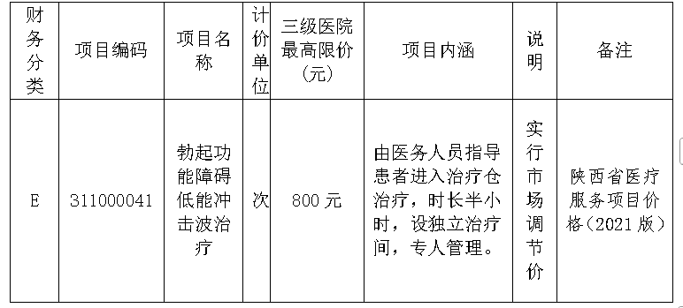 为了满足人民大众对男科疾病早期筛查、早期评估、早期干预的迫切需求,积极倡导“预防大于治疗”理念,更好开展男科业务,提高男科疾病的治疗效果,申请开展男科勃起功能障碍低能冲击波治疗。根据陕西省医疗保障局下发的《陕西省医疗服务项目价格(2021版)》实行市场调节价,经市场调研及结合我院实际情况,现将我院申报开展“勃起功能障碍低能冲击波治疗”医疗服务项目价格公示如下: