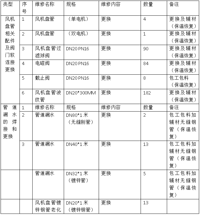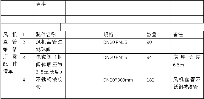 风机盘管及前端阀门故障维修更换清单