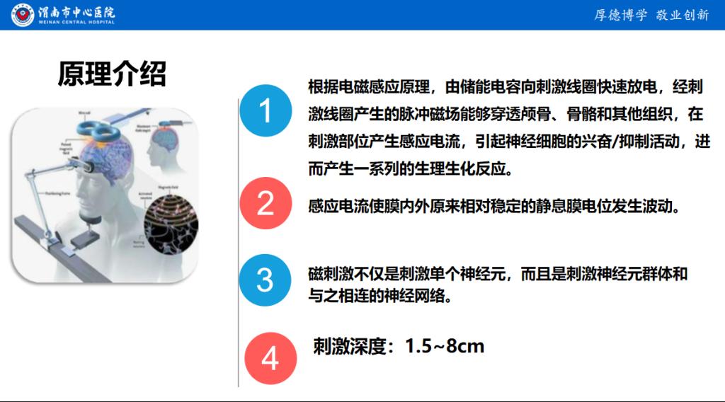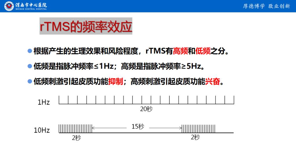 治疗原理:通过改变刺激频率,以兴奋或抑制局部大脑皮质兴奋性(高频率、高强度rTMS,可产生兴奋性突触后电位总和,从而兴奋刺激部位神经,低频刺激的作用则相反),促使神经网络重建,调节各种递质分泌,维持大脑平衡,最终达到对相关神经系统和精神类疾病的康复治疗目的。