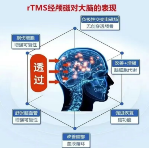 经颅重复磁刺激(rTMS)是一种非侵入性、无痛的神经调控技术,它利用交变的脉冲磁场作用于中枢和外周神经系统(主要是大脑),可特异性调节刺激脑区的神经兴奋性,精准作用于大脑特定区域(如与情绪、认知、言语、吞咽、肢体功能等相关的脑区),调节神经元活动,影响大脑神经功能和神经调控。