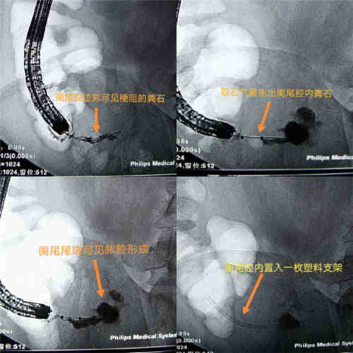 患者男性,因右下腹部疼痛不适入院,诊断为急性阑尾炎,CT提示阑尾周围脓肿形成并局限性腹膜炎。经保守治疗后病情无明显好转,医院普外科与消化内镜中心副主任曹鹏在反复分析病情后与病人沟通,制定了ERAT治疗方案。由于内镜下阑尾插管是整个ERAT技术的核心,加上阑尾较短,且在腹腔外游离度相对较大,所以插管较为困难。正常的阑尾开口是被Gealach’s瓣覆盖,会造成插管困难。于是在锥形透明帽的帮助下推开Gealach’s瓣,并进行阑尾逆行插管。随后,在内镜在X线引导下用取石气囊取出粪石,抽出大量脓液,并用甲硝唑进行阑尾冲洗引流,再成功为患者放置了内置引流管,手术用时1小时,患者术后腹痛等症状明显缓解,对内镜治疗效果非常满意。