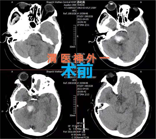患者女性,58岁,突然意识不清3小时,行头颅CT检查提示:脑干出血。入院时患者深度昏迷,GCS评分6分。患者脑出血部位特殊,病情危重,手术风险大,并且既往有高血压、糖尿病史,围手术期随时有死亡可能。神经外科一病区赵金安主任带领团队评估手术风险,立刻上报医院,并和家属及时沟通,经反复讨论后最后决定实施开颅脑干血肿清除术:一级入路为右侧乙状窦后入路;二级入路为三叉神经下一面听神经上脑桥侧安全区。